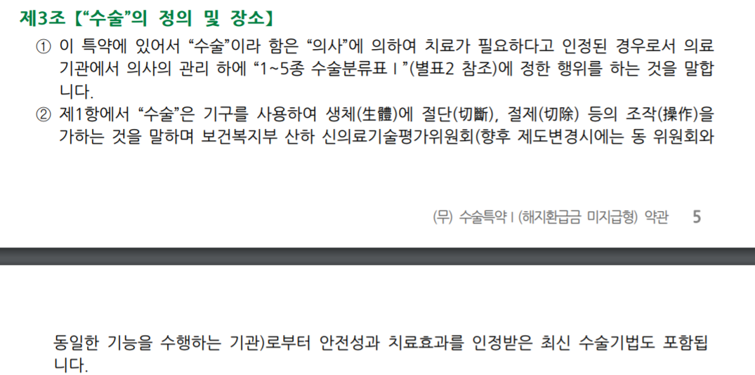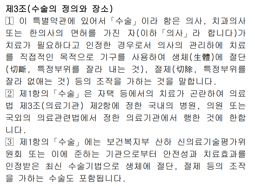 물론 여기서 말하는 수술이란 의학적 기준의 수술과 시술의 구분이 아니라, 보험금이 나가는 지점이 어디부터이냐라는 것이다.