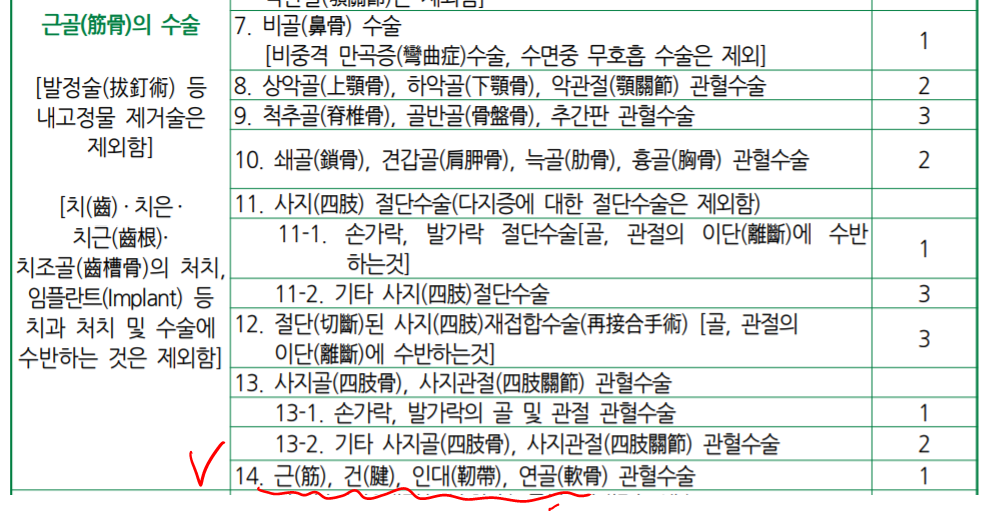 근, 건, 인대, 연골의 관혈수술은 1종 수술로 인정이 된다.